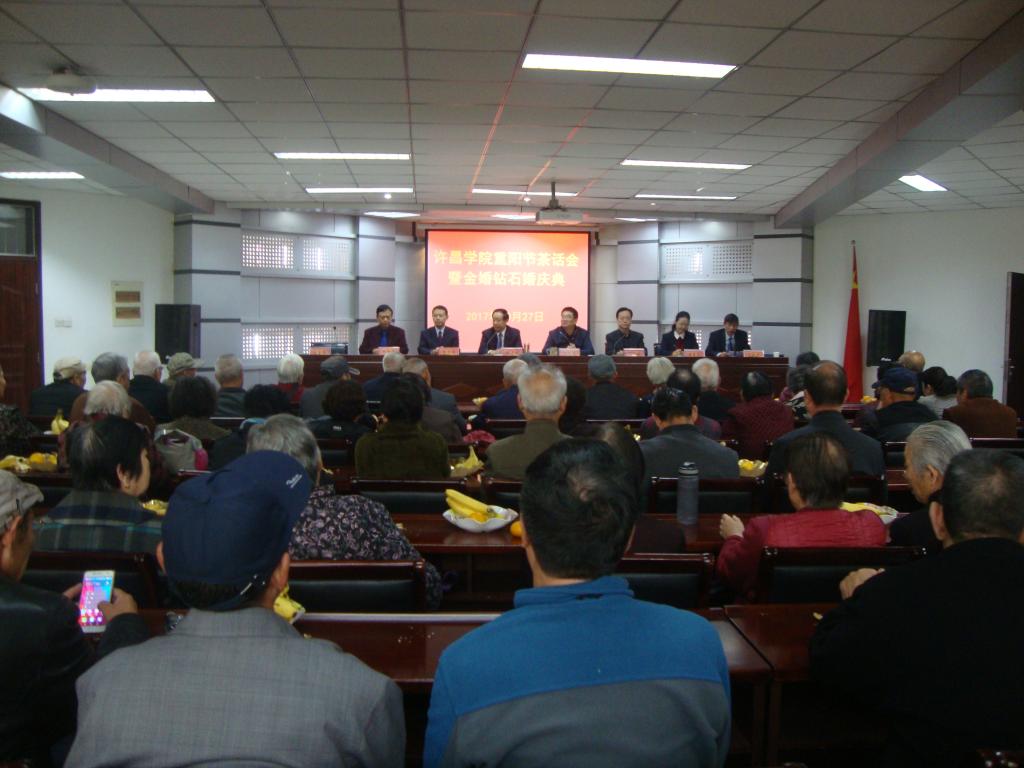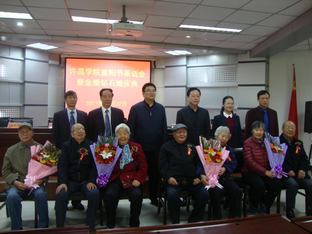 “金秋结硕果,人寿添花香”。27日上午,学校在第三会议室举行了2017年重阳节茶话会暨金婚钻石婚庆典。校党委书记闫纪建、党委副书记马超、工会主席杜志傲出席,党政办公室、组织部、离退休工作处负责同志和5对金婚钻石婚伉俪、百余名离退休老同志参加。茶话会和金婚钻石婚庆典由离退休工作处党总支书记马廷杰主持。